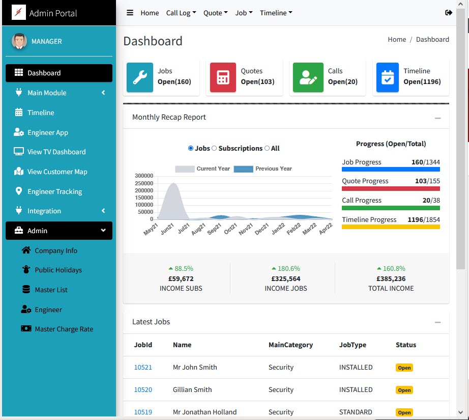 In the admin cloud application you can access of a host of Tracker Pro features , creating , editing and deleting jobs, calls, quotes, appointments, customers, installations, contracts and sites. Additionall, you can access the engineer tracking application, maps and traces to review the progresss of your engineers journey.