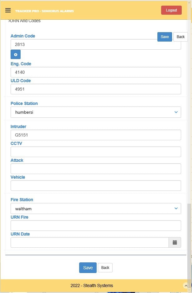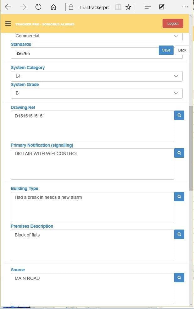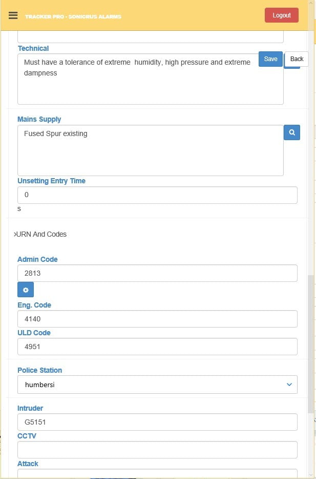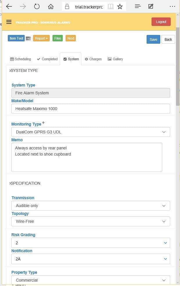 This allows users to view, access and update the system type, panel make and model, any important memo notes about the system, communicator type, URN numbers, engineer access codes plus other specification details. This data is saved with no need for back Office update work and can be used as part of a Quotation or as part of installation details update.