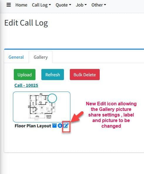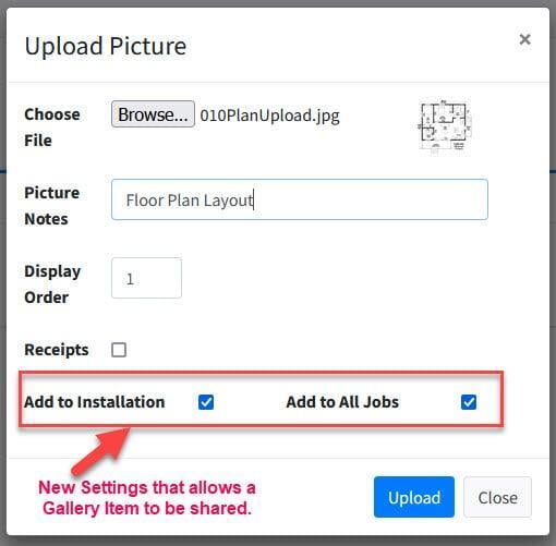 An enhancement has been published allowing Gallery pictures to be added and stored in the Installation record. Furthermore a new enhancement across all Gallery screens in the Engineer App, Admin App (Jobs, Calls & Quotes) allows a Gallery picture to be tagged for inclusion in all future jobs and to be added to the Installation.